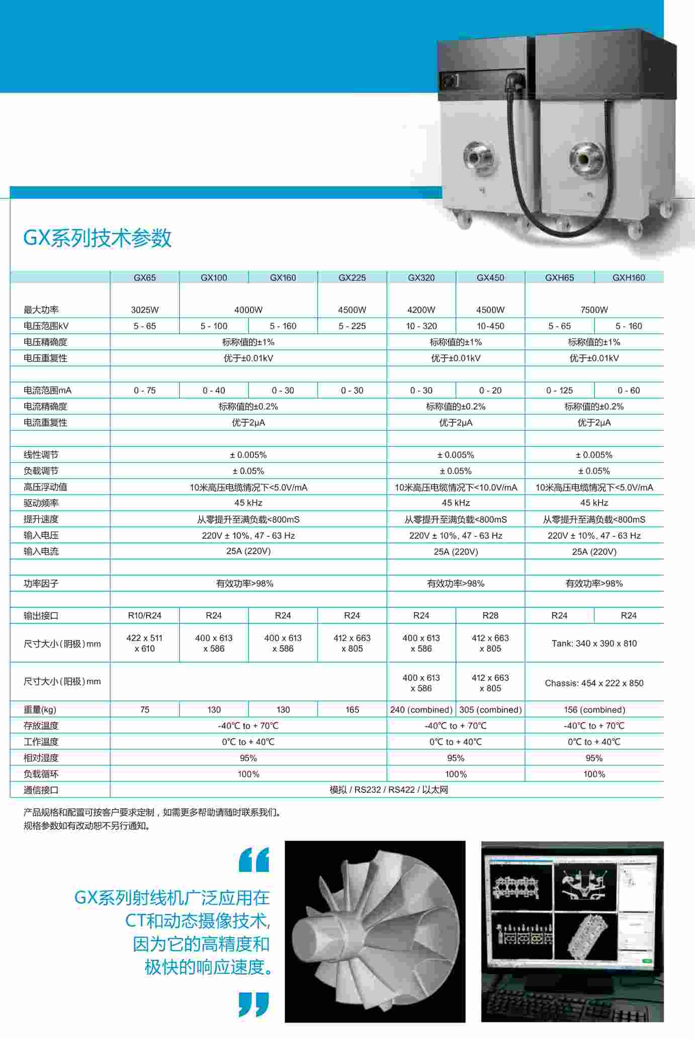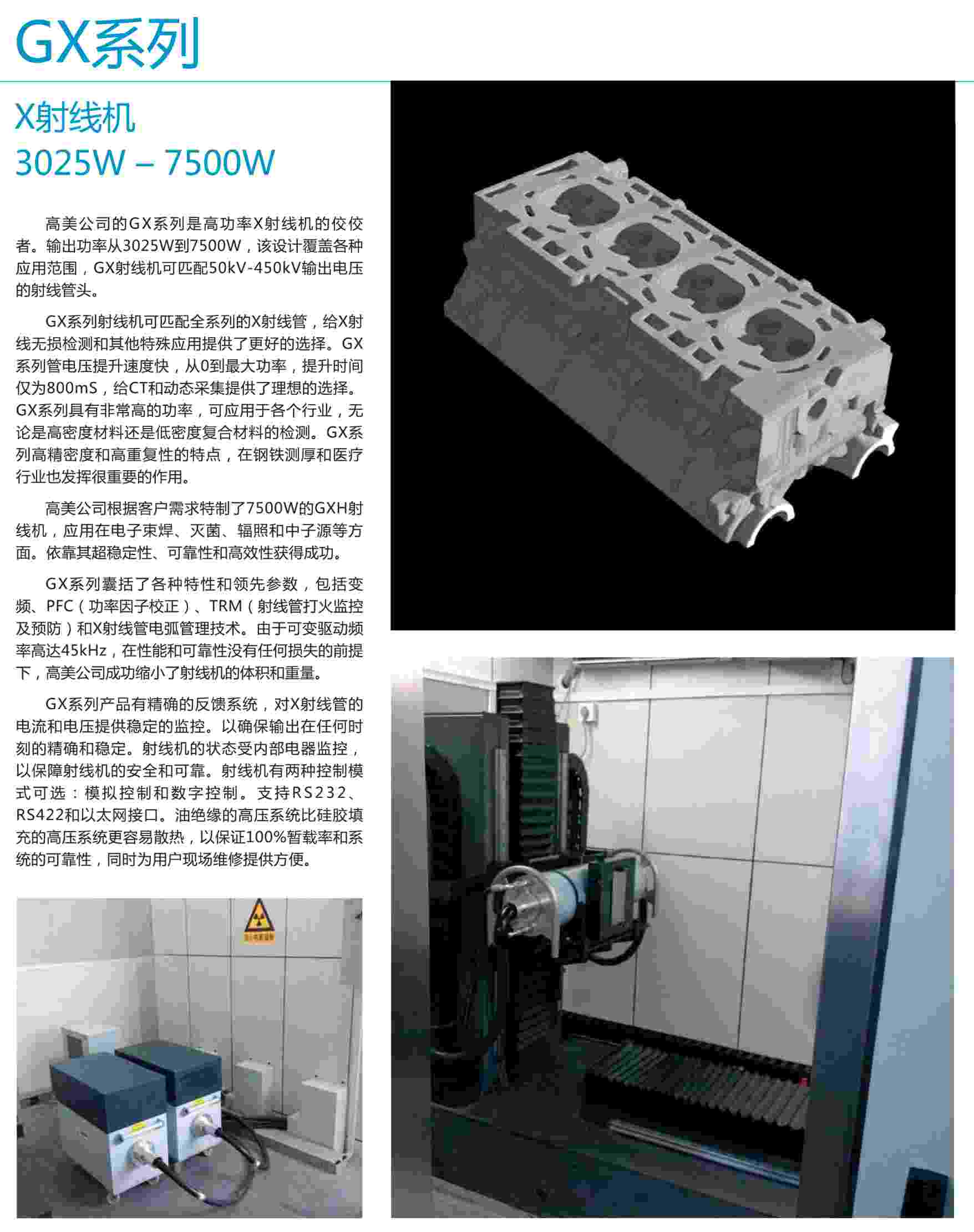 高美公司的GX系列是高功率X射線機(jī)的佼佼者。輸出功率從3025W到7500W,該設(shè)計(jì)覆蓋各種應(yīng)用范圍,GX射線機(jī)可匹配50kv-450kv輸出電壓的射線管頭。