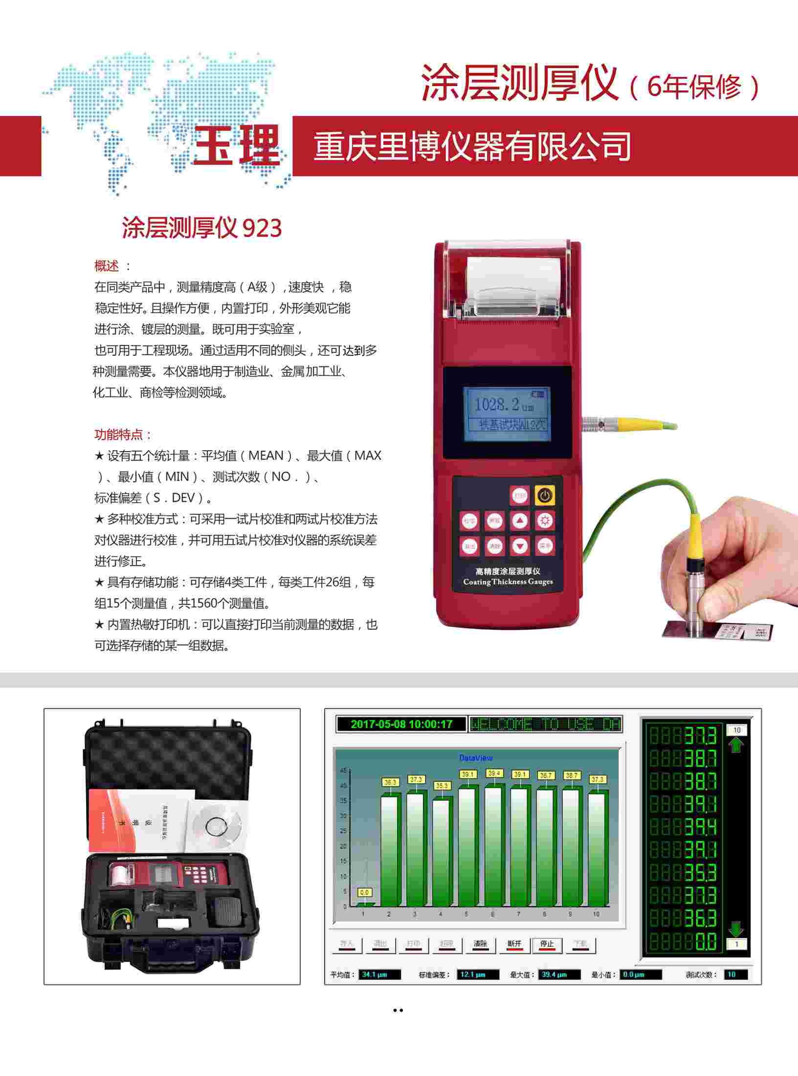 在同類產(chǎn)品中,測量精度高,速度快,穩(wěn)定性好。且操作方便,內(nèi)置打印,外形美觀它能進行涂、鍍層的測量。既可用于實驗室,也可用于工程現(xiàn)場。通過適用不同的側(cè)頭,還可達到多種測量需要。本儀器用于制造業(yè)、金屬加工業(yè)、化工業(yè)、商檢等檢測領(lǐng)域。本儀器符合以下標準:GB/T 4956-1985磁性金屬基體上非磁性覆蓋層厚度測量,磁性方法;GB/T 4957-1985非磁性金屬基體上非導電覆蓋層厚度測量,渦流方法。JB/T 8393-1996磁性和渦流式覆層厚度測量儀JJG 889-95《磁阻法測厚儀》 JJG818-93《電渦流式測厚儀》