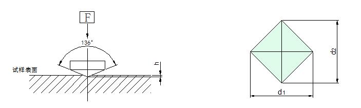 維氏硬度試驗(yàn)是用136°正菱形金剛石壓頭,以規(guī)定試驗(yàn)力(F)壓入被測(cè)試物體的表面,經(jīng)規(guī)定的保持試驗(yàn)力時(shí)間后,卸除試驗(yàn)力,用測(cè)微目鏡測(cè)量試件表面的壓痕對(duì)角線(d),計(jì)算壓痕的錐形表面積所承受的平均壓力(N/mm2),即維氏硬度值。(詳見圖1.1)。